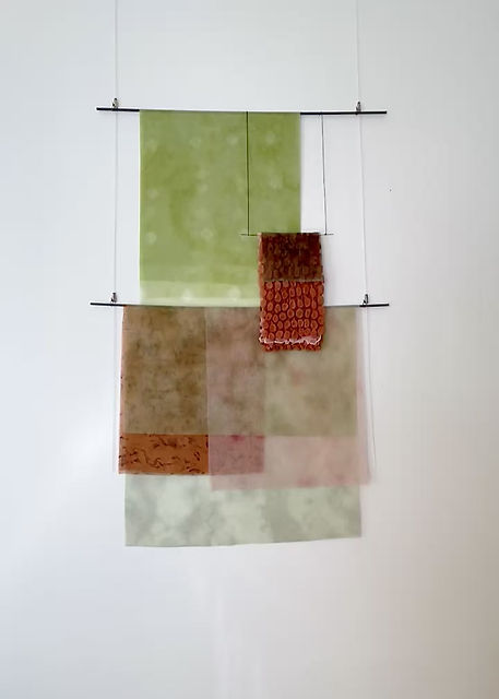 Accumulation de lés de tarlatane peints, teints, et mis en volume. Plis, lignes, froissements, empreintes retracent les réminiscences d’une déambulation poétique au Hameau de la Reine.